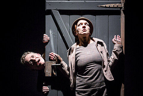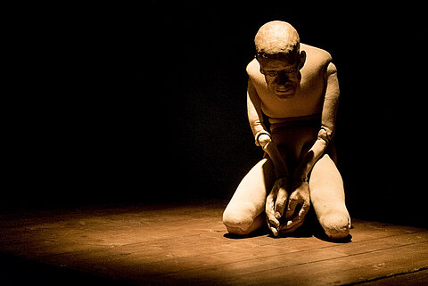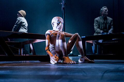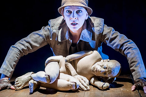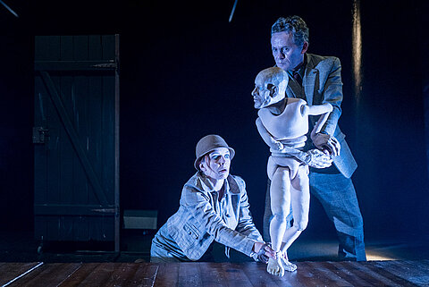 »Sabine Köhler und Heiki führen in ihrem virtuosen Spiel durch das (Gedanken-)Labyrinth des Protagonisten. Im wilden Wechsel von Stimmen, Musik und Klängen streiten, vermuten und widersprechen sie, bestärken, umschlingen und bedrohen sich gegenseitig. Gemeinsam steuern sie die Gänge der Puppe durch das Tunnelsystem, um im nächsten Moment selbst als Spielende den inneren Zwist der Figur in dialogischem Widerstreit auszutragen, während die Puppe als stiller Beobachter auf einem Podest an der hinteren Bühnenwand sitzt. Die starke Körperlichkeit der Gliederpuppe wird durch Physis und Mimik der Spieler*innen verstärkt.« (Fidena - Portal für Figurentheater und Puppenspielkunst)