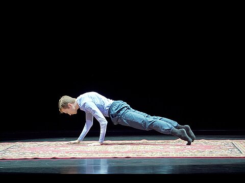 Wie wirkt sich gesellschaftlicher Erwartungsdruck auf das Individuum aus? Macht das ständige Performen uns Menschen zu Produkten? Diese Fragen inspirierten den Tänzer, der sich auf einem Teppich aus dem häuslichen Wohnzimmer bewegt und so die Intimität der Darbietung hervorhebt. Er möchte sich und damit uns befreien aus der Unnatürlichkeit eines performativen Lebens. Aber ist das überhaupt möglich?