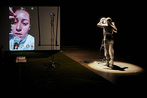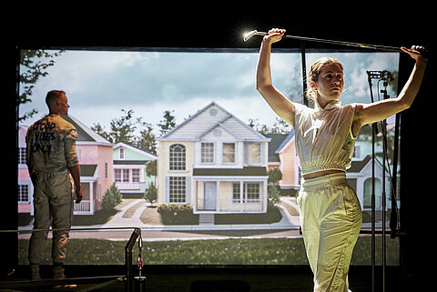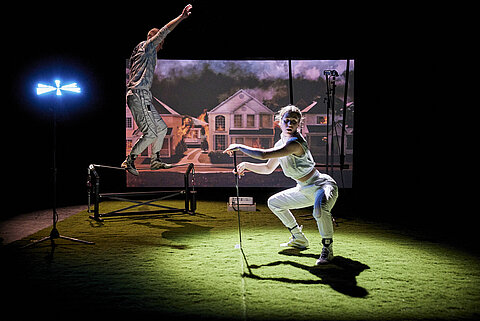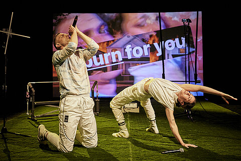 We see eight by two meters of green artificial turf. Behind it is a landscape on a large canvas with two people in the grass: "It's a perfect day." Yoga in the meadow, the smell of the forest, a bird emerging from a hologram. Two bodies balancing and floating, techno, sexuality, the dog upside down, the happy cat. A futuristic rap concert, a dystopia, a rift, cold and pleasure, cables, wireless connections, microphones and cameras. In the field of tension between nature made of plastic, real feelings and pixel tears, the performers move between authenticity and imitation.