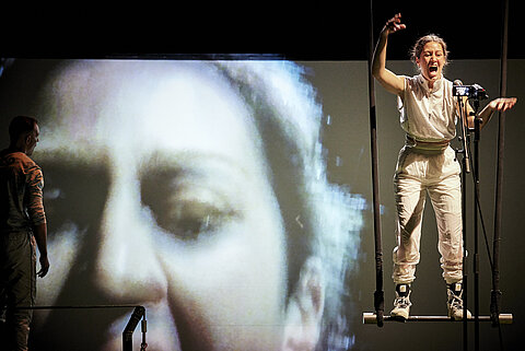 As an interdisciplinary performance, HEDONIA combines elements of contemporary circus with interactive technologies, video art, sound design, rap and text. Video, sound and movement are connected by live sensors and react to each other. By deconstructing traditional circus apparatuses, the tightrope and trapeze become installative objects and change their potential uses. The reconstructed tightrope is set up together with contact microphones and generates different types of sounds through movement impulses. The balance research on the trapeze placed just above the ground creates new performative contexts through interaction with a live camera. This not only ensures a further development of the performers' movement vocabulary, but also allows the otherwise superordinate circus objects to become equal actors in the collage-like stage set - alongside the artificial turf that functions as a green screen, the hologram projected into the space and the large projection screen. HEDONIA addresses the negotiation and navigation of our digital identities and interpersonal relationships in an age of increasing hyper-connectivity and simultaneous isolation. The piece experiments with the fusion of the digital and analog body and negotiates virtual identity as an extension of the self. It poses the question of whether and how the binary opposition between digital and physical reality can be overcome.
