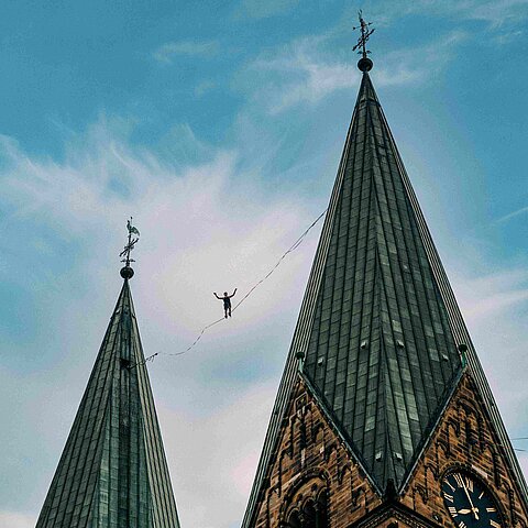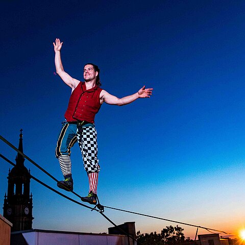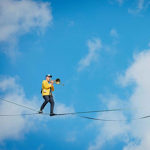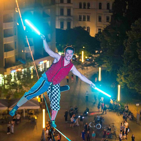 Zwischen 15 Meter hohen Masten spannt sich ein mehrstöckiges Netz aus Slacklines und Hochseilen. Darin bewegen sich die Highperformer Ruben Langer und Gregor Lawrenz gleichzeitig durch den Raum – unten, mittendrin und hoch über den Köpfen des Publikums. Was für die meisten Erdbewohner*innen schon beim ersten Schritt endet, beherrschen die Meister der Balance in Perfektion. Sie laufen, tanzen und schweben durch die Seilarchitektur und machen die Luft zur Spielwiese. Balance trifft auf Akrobatik, Jonglage auf Musik, Kontrolle auf den Moment, in dem sie kurz verloren geht. Wir freuen uns auf Hochseilkunst zum Staunen – mit Fackeln und Posaunen. Kribbeln im Bauch wird garantiert!