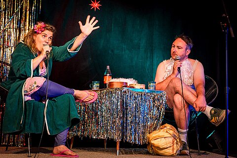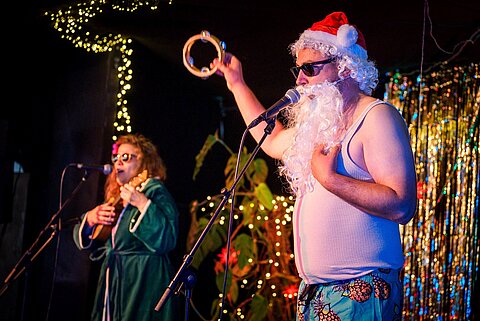 Mitten im Trubel des Advents wird das Foyer des Societaetstheaters bei Glühwein und Lametta zum Ort der Besinnung, der ironischen Selbstbetrachtung und der unterschiedlichen Perspektiven auf das heilige Fest. Als Host der dreiteiligen Weihnachtstalkshow nimmt der Regisseur und Performer Michael McCrae zusammen mit seinen Gästen – natürlich kritisch und immer fundiert – unsere familiären und kollektiven Traditionen in Ost und West in den Blick, das Schenken, das Erben und den Konsum im (Spät-)Kapitalismus. Fünf Jahre lang hat Michael McCrae in der wohl erfolgreichsten Weihnachtsproduktion mitgewirkt, die Dresden je gesehen hat: Der Bühnenadaption von »A Christmas Carol« von Charles Dickens, die Jahr für Jahr tausende Dresdner Familien in das Palais im Großen Garten lockte. Er fragte sich immer wieder: Warum war ausgerechnet diese Geschichte über den bösen Kapitalisten Ebenezer Scrooge, der sich aufgrund von nächtlichen Halluzinationen zum guten Kapitalisten wandelt, solch ein großer Erfolg im postsozialistischen Dresden? Gemeinsam mit der Musikerin Stephanie Krah begibt er sich auf die Suche nach Antworten. Als Gäste hat er sich dafür unter anderem Darsteller*innen der 2020 abgesetzten Inszenierung eingeladen, wie Lars Jung (Scrooge), Anna-Katharina Muck (Mrs. Cratchit) oder Jürgen Haase (Marley).